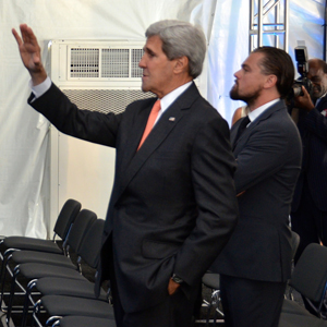 The Earth Observing System (EOS) Science Program Support Office (SPSO) organized and coordinated NASA’s Hyperwall presence at Our Ocean Conference 2014, hosted by U.S. Secretary of State John Kerry. The meeting took place at the U.S. Department of State in Washington, DC, June 16-17, 2014. Several senior-level managers from NASA Headquarters and Goddard Space Flight Center used the Hyperwall to deliver presentations highlighting NASA’s role in studying Earth’s ocean from space. On day two of the meeting, John Kerry and environmental activist and American actor and film producer Leonardo DiCaprio visited the Hyperwall. To learn more and to view photos from the event, check out the September-October issue of The Earth Observer newsletter.